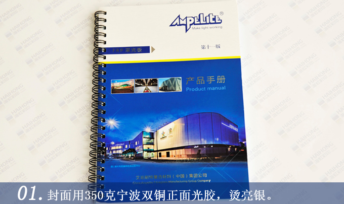 - 封面用350克寧波雙銅正面光膠,燙亮銀。內(nèi)頁用300克雙銅紙雙面4色彩印,黑色鐵絲圈裝。